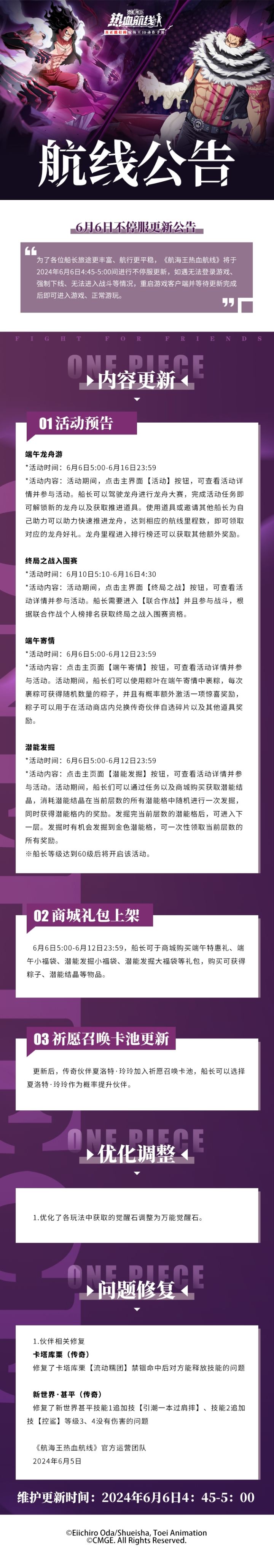 ⭐6月6日不停服更新公告⭐为了各位船长旅途更丰富、航行更平稳,《航海王热血航线》将于2024年6月6日4:45-5:00间进行不停服更新,如遇无法登录游戏、强制下线、无法进入战斗等情况,重启游戏客户端并等待更新完成后即可进入游戏、正常游玩。↓↓↓更新详情如下↓↓↓