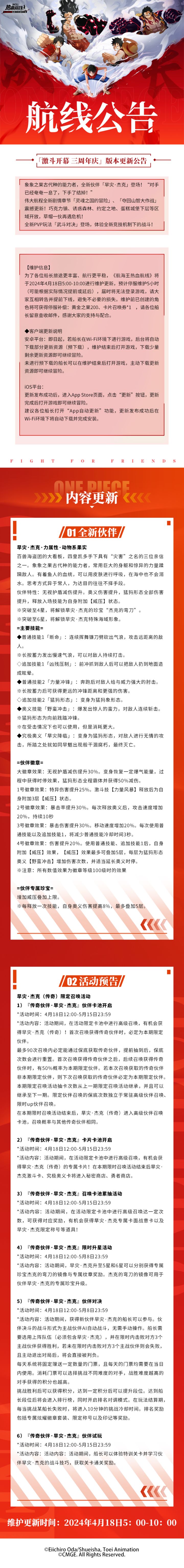 ⭐「激斗开幕 三周年庆」版本更新公告⭐象象之果古代种的能力者,全新伙伴「旱灾·杰克」登场!“对手已经奄奄一息了,下手了结掉!”伟大航程全新剧情章节「灵魂之国的冒险」、「夺回山智大作战」震撼更新!巧克力镇、诱惑森林、约定之地、蛋糕城堡下层等区域开放,草帽一伙再遇危机!全新PVP玩法「武斗对决」登场,体验全新竞技机制下的战斗!为了各位船长旅途更丰富、航行更平稳,《航海王热血航线》将于2024年