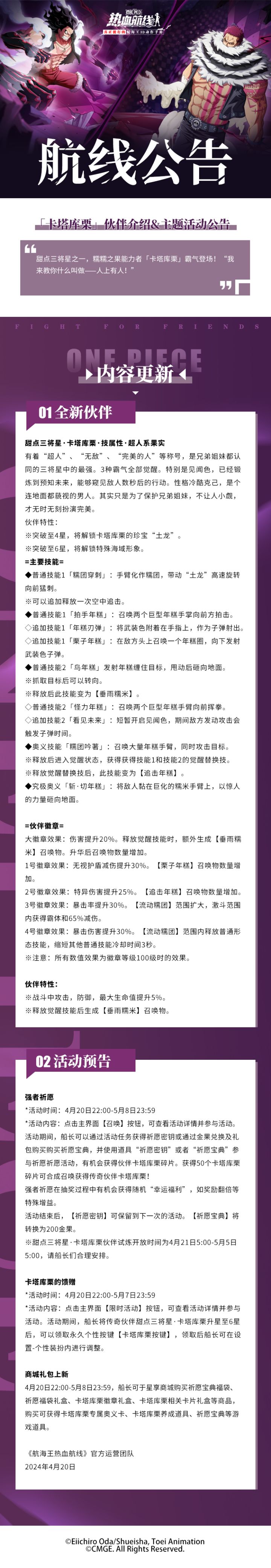 ⭐「卡塔库栗」伙伴介绍&主题活动公告⭐甜点三将星之一,糯糯之果能力者「卡塔库栗」霸气登场!“我来教你什么叫做——人上有人!”↓↓↓活动更新详情如下↓↓↓