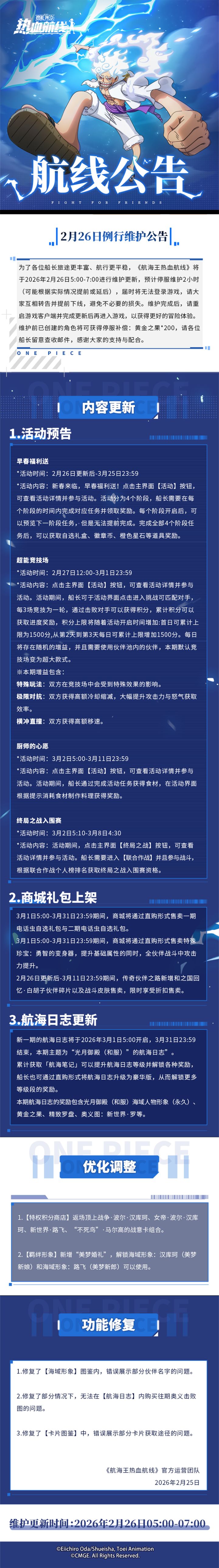 ⭐2月26日例行维护公告⭐为了各位船长旅途更丰富、航行更平稳,《航海王热血航线》将于2026年2月26日5:00-7:00进行维护更新,预计停服维护2小时(可能根据实际情况提前或延后),届时将无法登录游戏,请大家互相转告并提前下线,避免不必要的损失。维护完成后,请重启游戏客户端并完成更新后再进入游戏,以获得更好的冒险体验。维护前已创建的角色将可获得停服补偿:黄金之果*200,请各位船长留意查收