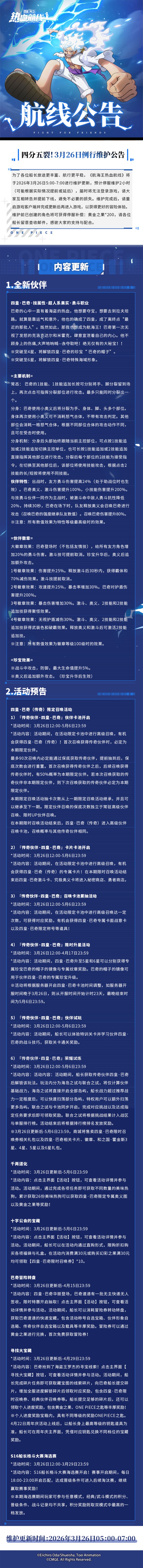 3月26日例行维护公告|四皇·巴奇来袭,十字公会狂欢启幕