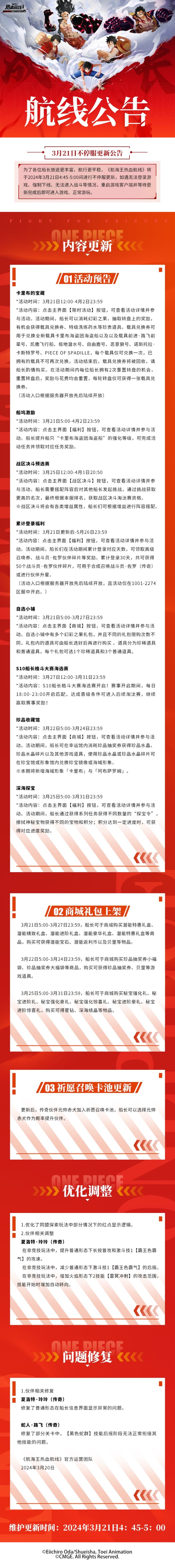 ⭐3月21日不停服更新公告⭐为了各位船长旅途更丰富、航行更平稳,《航海王热血航线》将于2024年3月21日4:45-5:00间进行不停服更新,如遇无法登录游戏、强制下线、无法进入战斗等情况,重启游戏客户端并等待更新完成后即可进入游戏、正常游玩。↓↓↓更新详情如下↓↓↓