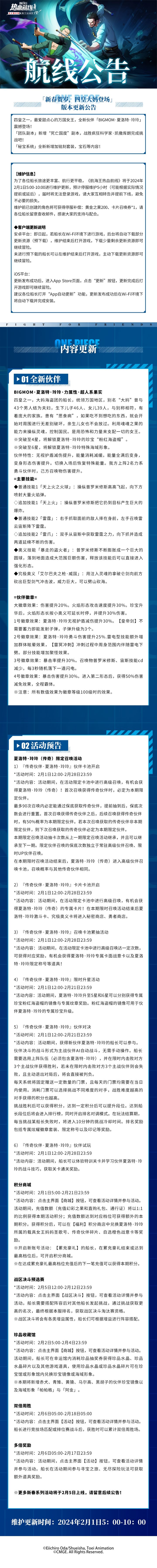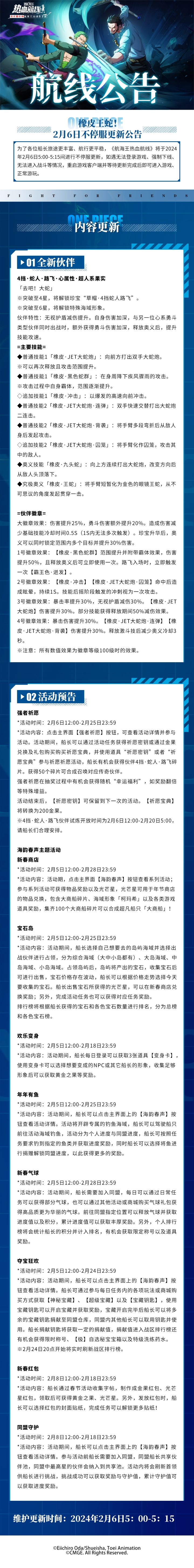 ⭐橡皮王蛇!2月6日不停服更新公告⭐为了各位船长旅途更丰富、航行更平稳,《航海王热血航线》将于2024年2月6日5:00-5:15间进行不停服更新,如遇无法登录游戏、强制下线、无法进入战斗等情况,重启游戏客户端并等待更新完成后即可进入游戏、正常游玩。↓↓↓更新详情如下↓↓↓