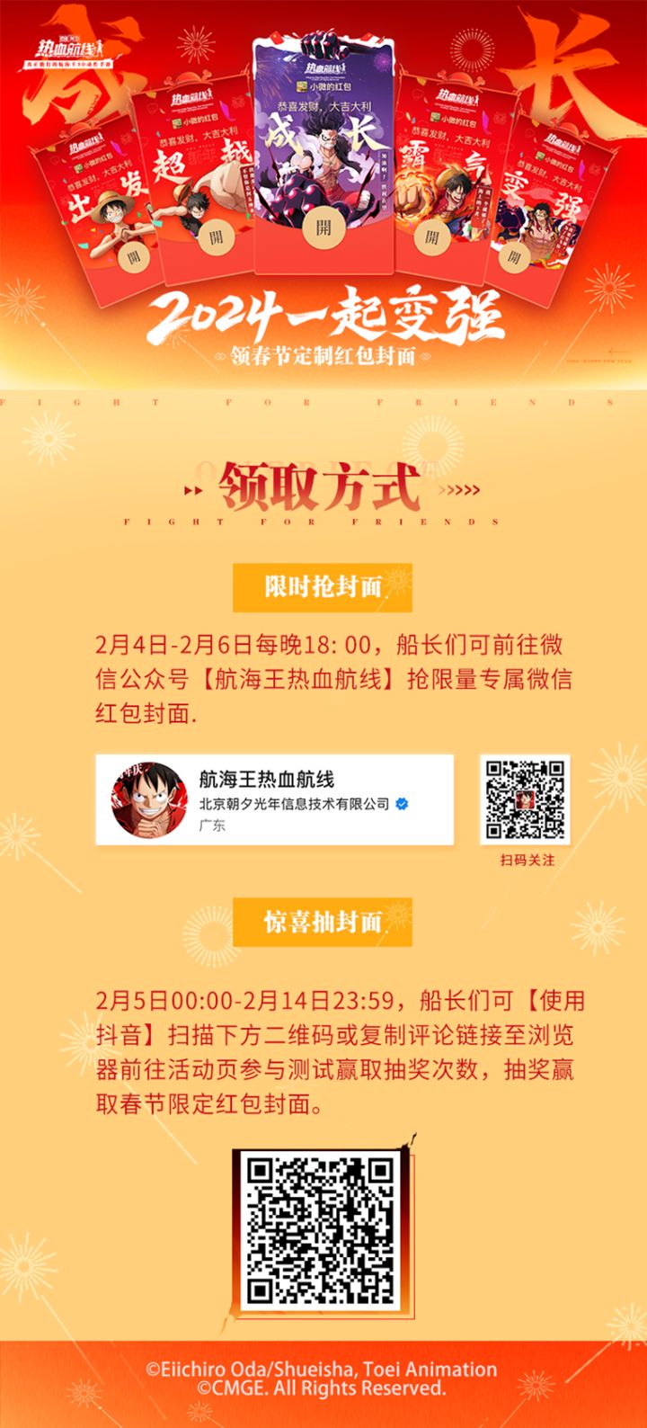 ⭐新春微信红包封面领取指南⭐四皇夏洛特・玲玲现已上线,四挡蛇人路飞即将登场!领取春节定制红包封面,在龙年里继续启程冒险,期待与船长们共度一个充满热血和感动的新年!2月4日-2月14日,航海王热血航线红包封面派送开启!详细领取指南如下图所示,定制红包封面数量有限,先到先得哦!