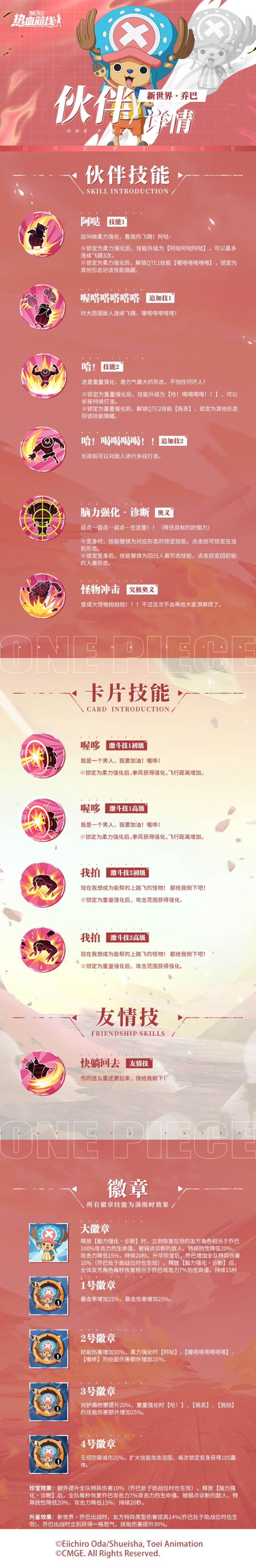 传奇伙伴「新世界·乔巴」终于要和各位船长见面啦,乔小巴先带大家看一波新伙伴的技能详情吧!学会进化成强大的怪物而不丧失理智的他,终于能在游戏内同其他新世界的草帽团伙伴并肩作战!10月25日,全新传奇伙伴登场,秋日馈赠活动也还在持续解锁中。船长们别忘了前往游戏完成任务,获取更多的伙伴碎片呀~↓↓↓伙伴技能详见长图介绍↓↓↓