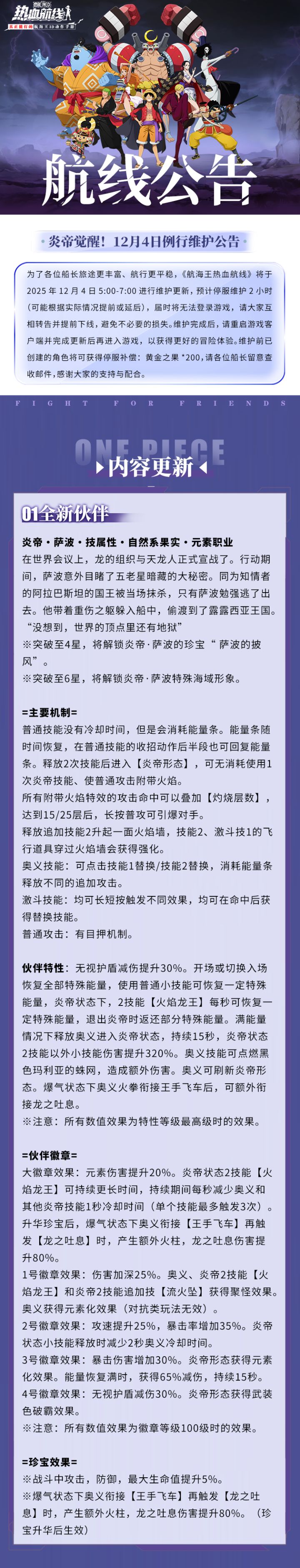 炎帝觉醒!热血焕新来袭!全新技系传奇伙伴炎帝・萨波炽热登场,限定卡池、专属活动同步开启!赛事升级与海量福利齐上线,助力船长燃战航线!>>>全新传奇伙伴登场炎帝・萨波登场时间:12 月 4 日 12:00>>>重磅活动开启炎帝・萨波强者祈愿卡池开启,累计任务还可解锁限定奥义图!萨波的小船限时折扣直购,助力船只直升 3 星!超大竞技场来袭,加入极限对抗,战斗火力全开!S15 格斗大赛海选