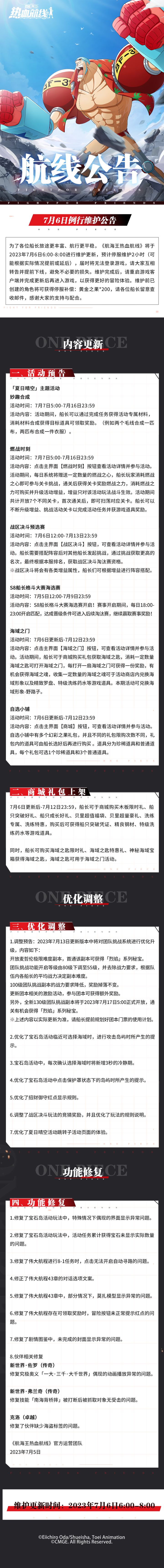 ⭐7月6日例行维护公告⭐为了各位船长旅途更丰富、航行更平稳,《航海王热血航线》将于2023年7月6日6:00-8:00进行维护更新,预计停服维护2小时(可能根据实际情况提前或延后),届时将无法登录游戏,请大家互相转告并提前下线,避免不必要的损失。维护完成后,请重启游戏客户端并完成更新后再进入游戏,以获得更好的冒险体验。维护前已创建的角色将可获得停服补偿:黄金之果*200,请各位船长留意查收邮件