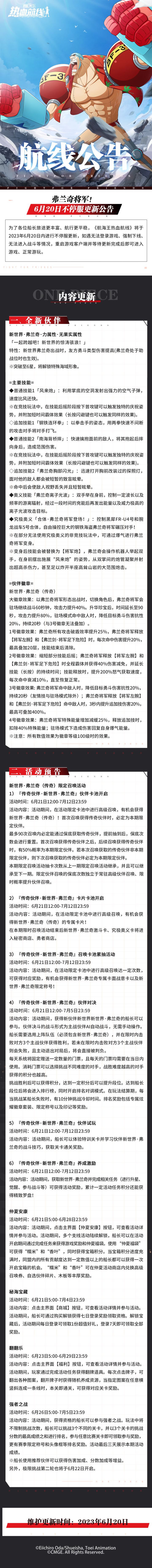 ⭐弗兰奇将军!6月20日不停服更新公告⭐为了各位船长旅途更丰富、航行更平稳,《航海王热血航线》将于2023年6月20日内进行不停服更新,如遇无法登录游戏、强制下线、无法进入战斗等情况,重启游戏客户端并等待更新完成后即可进入游戏、正常游玩。↓↓↓更新详情如下↓↓↓
