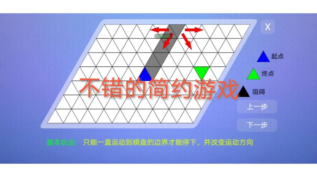 画面显示三种颜色的三角形,玩家要从蓝色三角到绿三角的位置,当遇到黑色的三角就会停下来,由六个方向按钮去操控三角的路径,往一个方向走只会在遇到障碍或者尽头的时候停下来#iOS游戏研究所#游戏安利#游戏推荐#游戏讨论