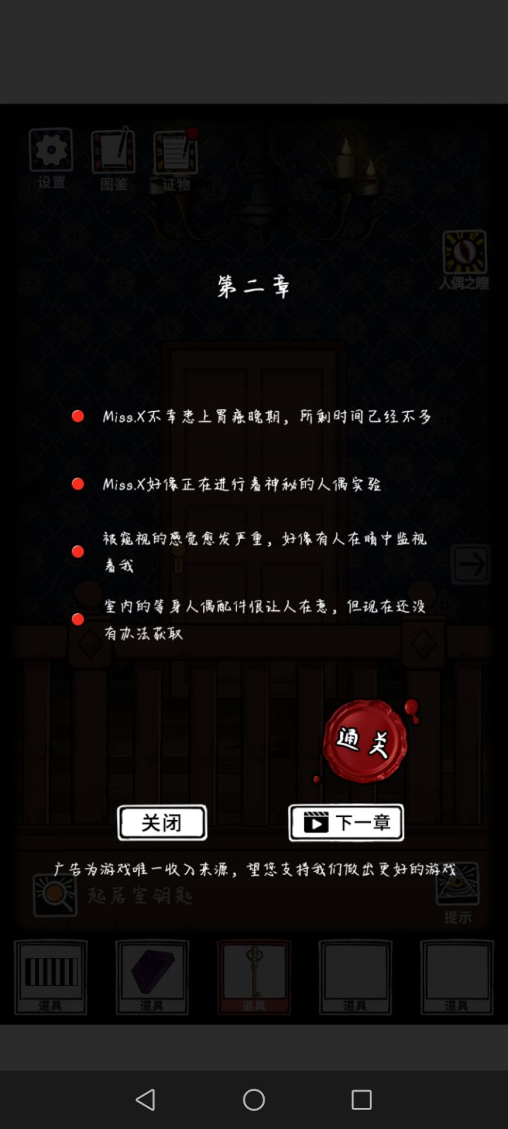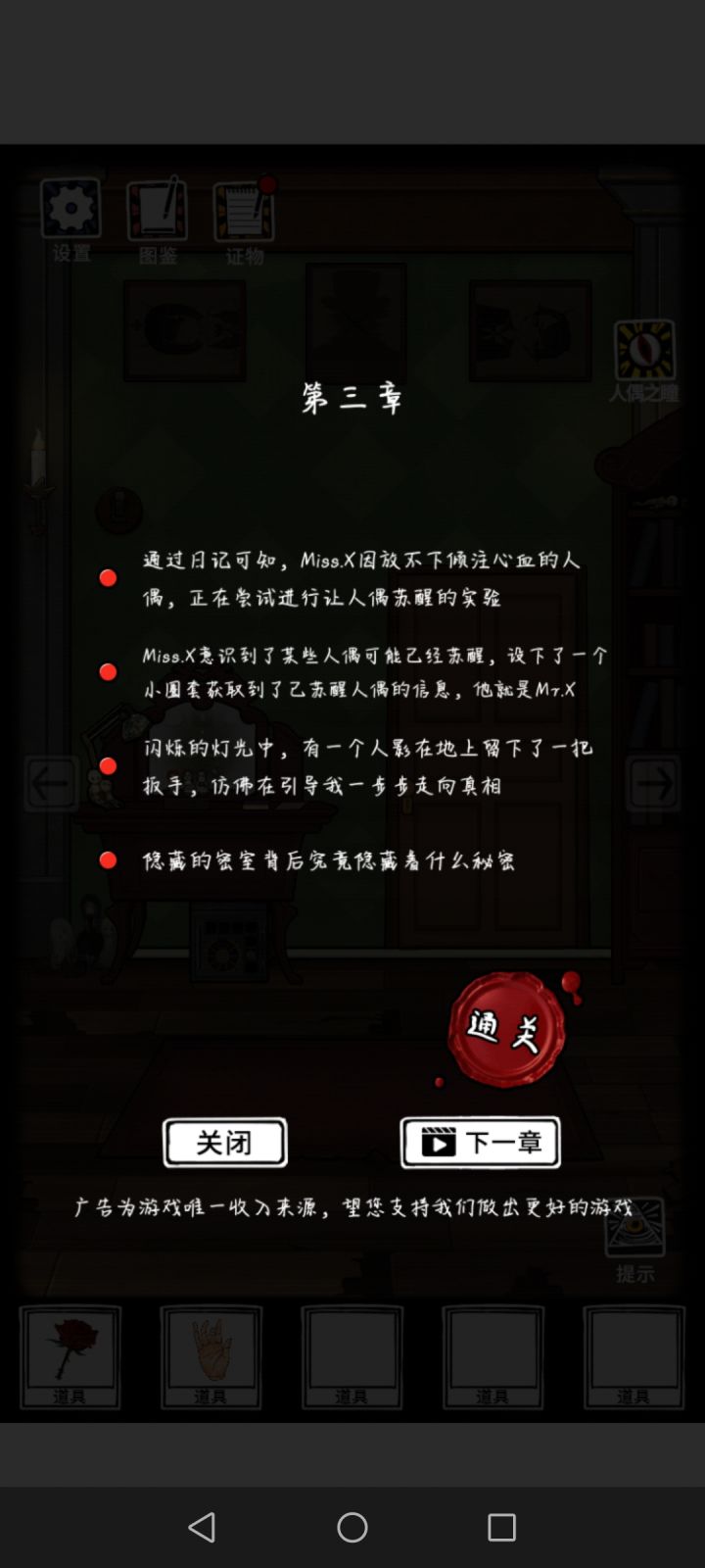 来个人告诉孩子吧,哪里错了,配件全有了,但就是一直显示不全,我对比给的线索图,反复比对,就花瓶图案不一样,但是看大佬们的攻略,也没有要改变花瓶图案啥的,头秃,然后顺便和和我有一样问题的,下一章进不去的,可以把网络关掉重新连接就有用了,不过它是一次性的,下次你要看广告或者下一章是还是要重复关网重连