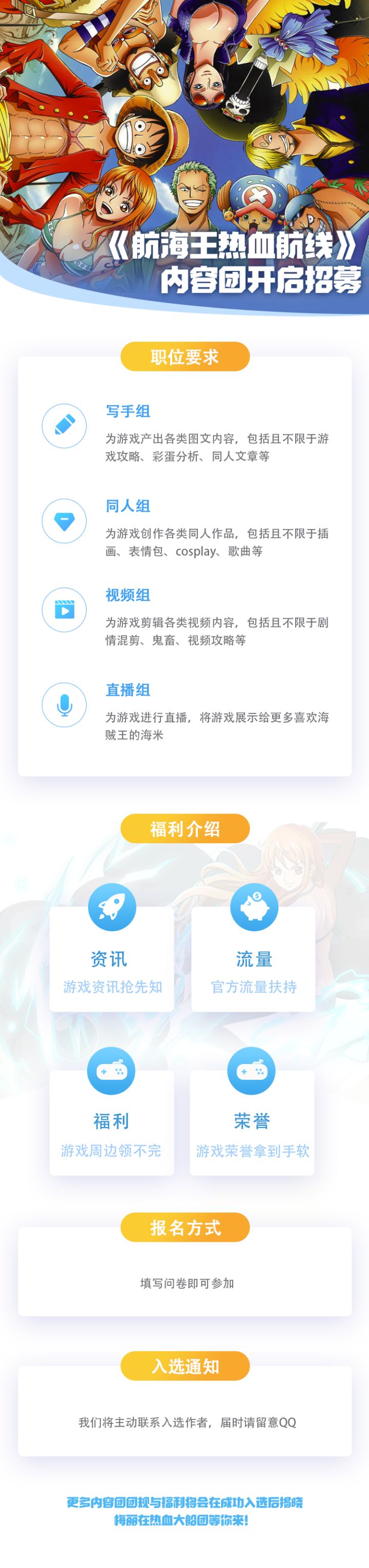 各位船长大家好!我是海鸥哥!当鸡啄完了米,桃之助舔完了面,火烧断了锁之后我们的游戏终于要准备与大家初次见面了!为了记录船长们紧张刺激的航海旅程,传授航海经验,并让居民们一睹各位海上勇士的风采,特此招募具有创作才华的能力者们,成立“热血大船团”。如果你足够喜欢航海王,热衷于创作精彩的内容,且对高质量超还原的航海王手游抱有期待,那么海鸥哥在此等待着你们的加入!内容团介绍及报名方式如下:报名方