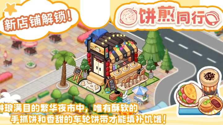 琳琅满目的繁华夜市中,唯有手抓饼才能填补饥饿。不过偶尔也可以换换口味,比如感受一下海鲜馅料的蚵嗲煎和甜蜜满满的车轮饼带来的另一种饱腹感。最后捧着超出名的奶茶,继续在夜市里感受热闹的氛围吧。新款店铺【饼煎同行】现已上架。————————————卡通美食模拟经营类游戏《饮料小镇》已开放下载,欢迎店长们点击下方按钮下载,共建风光秀丽的饮料小镇~