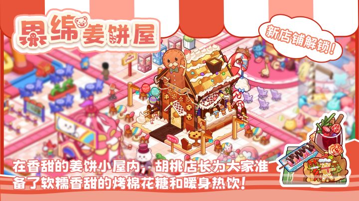 “这里是姜饼搭建的温馨小屋。”“大家可以在这里为美味的姜饼小人搭配各种装扮;而胡桃店长会提供软糯香甜的烤棉花糖和暖身的果味热饮给大家随时享用!”新款店铺【果绵姜饼屋】现已上架。————————————卡通美食模拟经营类游戏《饮料小镇》已开放下载,欢迎店长们点击下方按钮下载,共建风光秀丽的饮料小镇~