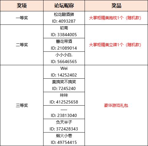 非常感谢各位掌柜对本次活动的支持!以下为活动得奖名单: 恭喜以下掌柜获得游戏礼包一份(珍兽果*5、人参*3、随机书籍*20、声望符*5、商铺图纸*2、分钟卡*10、算盘*5、募工金牌*5) 目前游戏礼包已经在发放,请各位掌柜留意游戏内邮件哦! 另外,老壶选出了两位掌柜送上特别奖励京东卡50元,以感谢您二位的用心支持。 请两位掌柜尽早联系老壶哦~ 衷心感谢以上所有掌柜对游戏的支持,