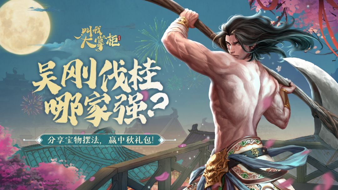 感谢各位掌柜的积极参与,接下来公布中奖名单,快来看看有没有你鸭~ 【获奖名单公示】 温馨小提示:奖励将在公布获奖名单的7个工作日内发放,请掌柜们注意查收~ ======分割线====== 掌柜们掌柜们,明天就是中秋节了!在这里,老壶先祝各位掌柜,中秋节快乐! 在这金秋时节,新玩法“吴刚伐桂”也和各位掌柜见面了! 在这个玩法中,不同排列的宝物,给吴刚带来的伐木收益是不一样的。 那么聪明的掌柜们,您的
