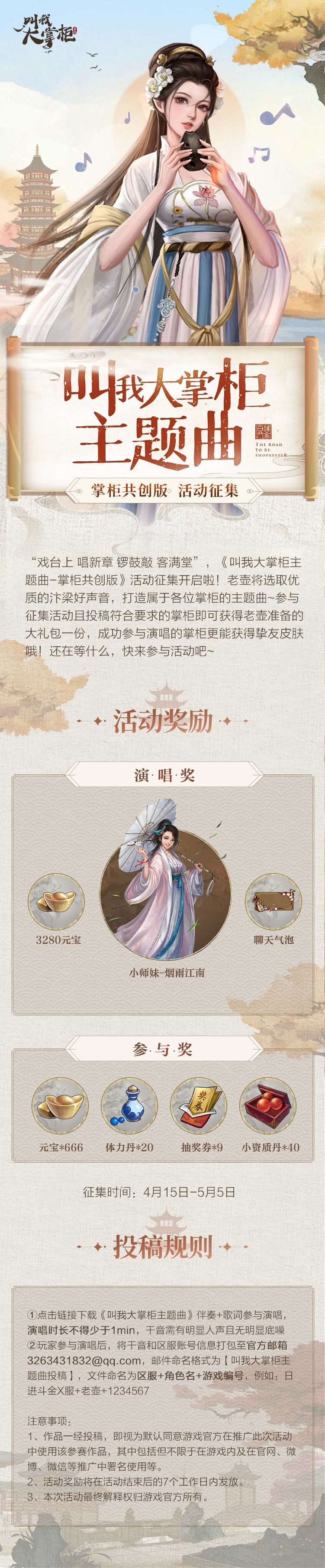 咚咚咚~各位汴梁歌神集合!《叫我大掌柜主题曲-掌柜共创版》合唱征集活动开启啦~老壶将为各位掌柜打造属于自己演唱的主题曲,是不是十分期待呢!掌柜们只需下载主题曲伴奏+歌词参与演唱,并发送干音(纯人声无伴奏)到官方邮箱即可成功参与活动,每位参与的掌柜都可获得老壶赠出的元宝大礼包一份,被选中参与演唱的掌柜更可以获得小师妹的挚友皮肤哦!快拿起麦克风,一起“戏台上,唱新腔”吧~老壶期待着各位歌神的参与! 主