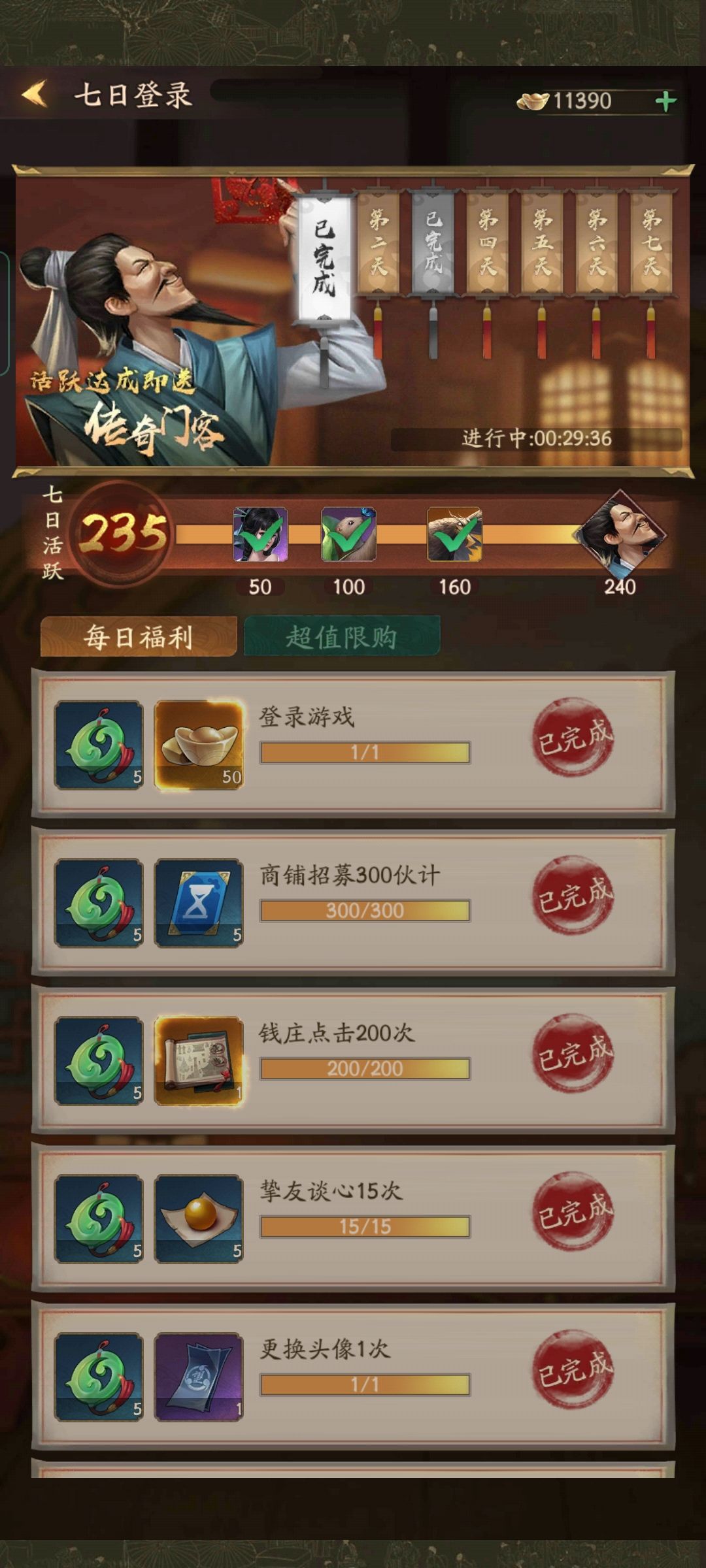 吐槽前提: 因为自己最后就差5点拿到传奇的门客,所以过来分享一下经验~希望后面的娃子能拿到! 自我情况: 1.无氪金 2.每日会上线做做任务,差一点做满or做满 3.等级16,赚速40万每秒左右 本贴含有细节分析和最后的总结,想看总结可以跳到最后。 想看细节的朋友来这(*σ´∀`)σ,下面我们看图 1. 第一天我们是可以全部做完的! 大家可以一一比对去完成。特别关注那些需要时间等的一些任务,这些要