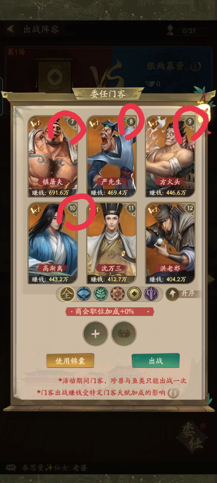 财运亨通30区 同福客栈 难相拥本人有幸带领商会拿过一次冠军,虽然是运气成分占多,但是排兵布阵也非常重要,下面来教大家排兵布阵。群英重点1.门客的出战顺序是按上阵的时候的顺序出战,但是会长>副会长>精英是必定在前面,必要时候可以不要副会长和精英,或者会长副会长精英转移给别人。调整顺序。2.三种锦囊中最无用的是+300%,减30%赚速要搭配大门客使用,大门客统一用+50%或者伏兵。进入正题