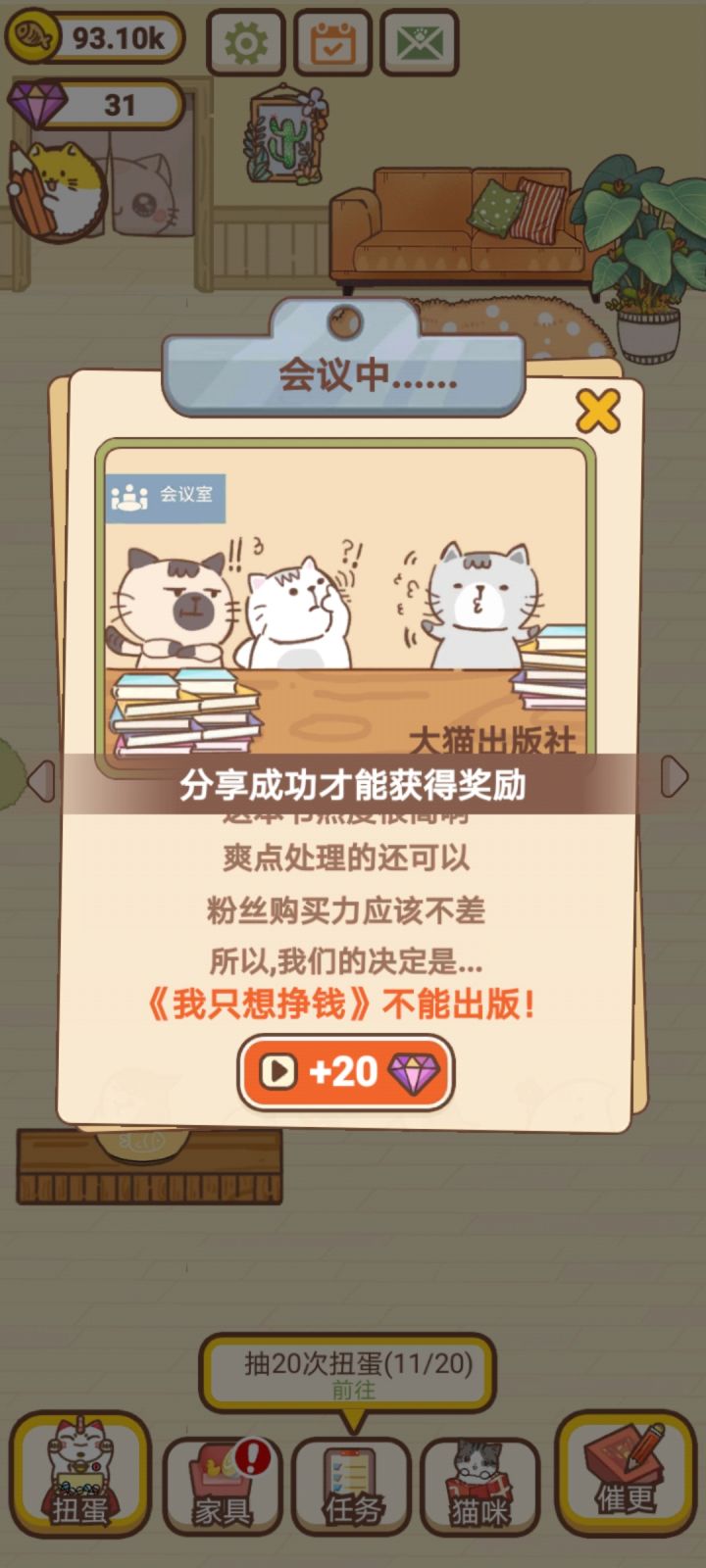 第一,如果可以添加桌子就好了,只有九个猫咪位置不够用啊,挣钱速度基本跟不上猫粮消耗,猫粮还难抽到。第二,那些学校花园解锁条件是什么,一直都没有显示过,很茫然