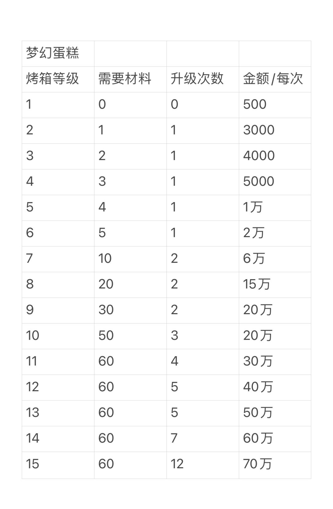 梦幻蛋糕店,烤箱每级属性,升级材料和所需金币