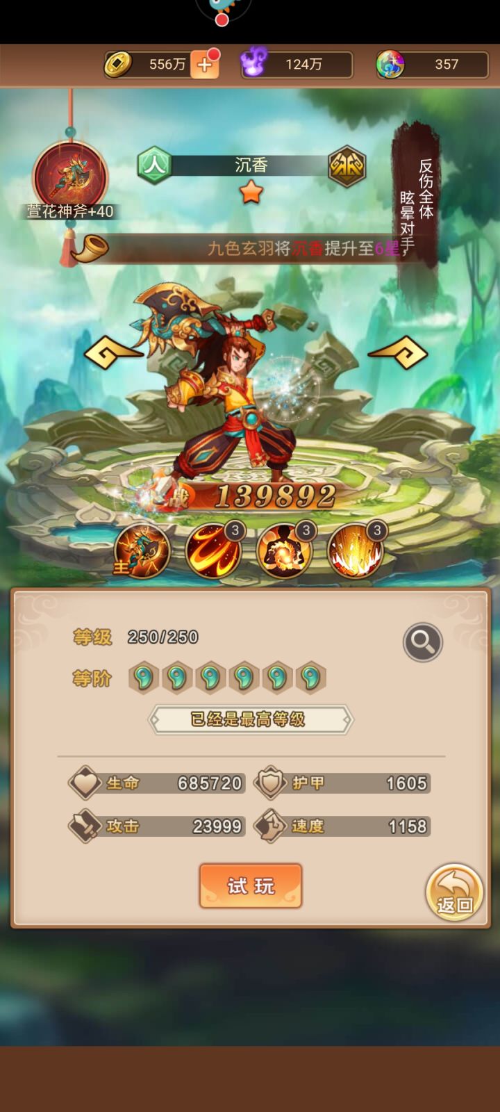 开局沉香,不用想了玩吧,你绝对是欧皇中的欧皇。独特的反伤机制使他拥有一打五的能力,赋予了他无限可能。前期极限拉到10星再培养其他c位。养成难度不高,白嫖途径众多,前期可以使你玩的顺风顺水。推荐度5星附白嫖沉香获取途径主线第9关,七日任务,端午活动(限时),八卦转换,基本也是白嫖,狗粮再利用。开局无天,如来,恭喜你,白嫖红装,赢在起跑线,有了装备的优势即使不是最顶尖的那些英雄基本前期也可以顺利