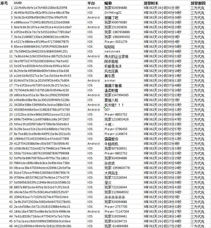各位机长们:《银翼战机》致力于打造绿色公平的游戏环境,严禁在游戏过程中使用外挂类工具,破解、修改游戏内道具以及在非官方渠道进行违规代充。我们对于这类玩家将会十年封号处理,打击非法游戏行为官方零容忍!以下是近期部分国际服封号名单【常见问题解答】问:三方代充是否是真实的呢?如果充值了会导致账户被封禁么?答:目前所有的三方代充(手机厂商官方平台充值除外)均为无效且非法行为,凡是以低价宝石、低价装