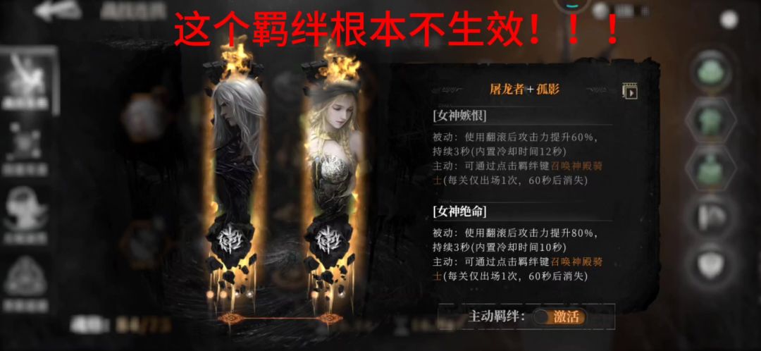 屠龙者和孤影的羁绊不生效!! 试了无数次,真的不生效! 搞得我每次紧张的要死,卡那三秒攻击加成,结果终究是我错付了。。。。。