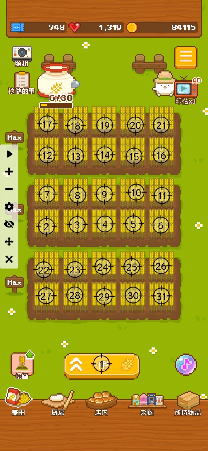作为这款游戏的深度爱好者,今天和大家分享一下怎样快速完成全图鉴首先,当你攒够金币了首当升级的就是小麦地,优先开满三块地以后再把地升级到二级以上(后面我会讲解一下这游戏卡广的步骤),所以金钱方面不用太担心会不够用接着就是一个新手玩家会忽略的一个点,就是面包做好以后没卖完的话,超过24小时以后面包会坏掉。所以当天没卖完的面包记得点击返回(图一),这样就可以把没卖完的面包收起来,等第二天再拿出来就不