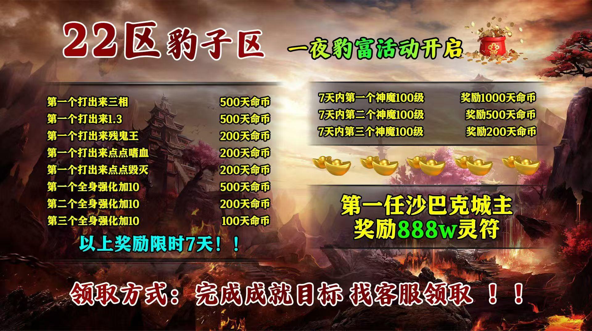 亲爱的勇士:承载万千期待,《龙城秘境 - 重返冰雪 2019》22 服【豹子区】将于2025 年 11 月 23 日 19:00正式开服!复刻 2019 经典冰雪生态,专属 “一夜豹富” 活动限时开启,高爆打金、跨平台竞技、千万奖池三重狂欢,邀你再战冰封大陆,轻松实现财富自由!⚡ 核心开服信息新服名称:22 服【豹子区】(暴富专属区)开服时间:2025 年 11 月 23 日 19:00活