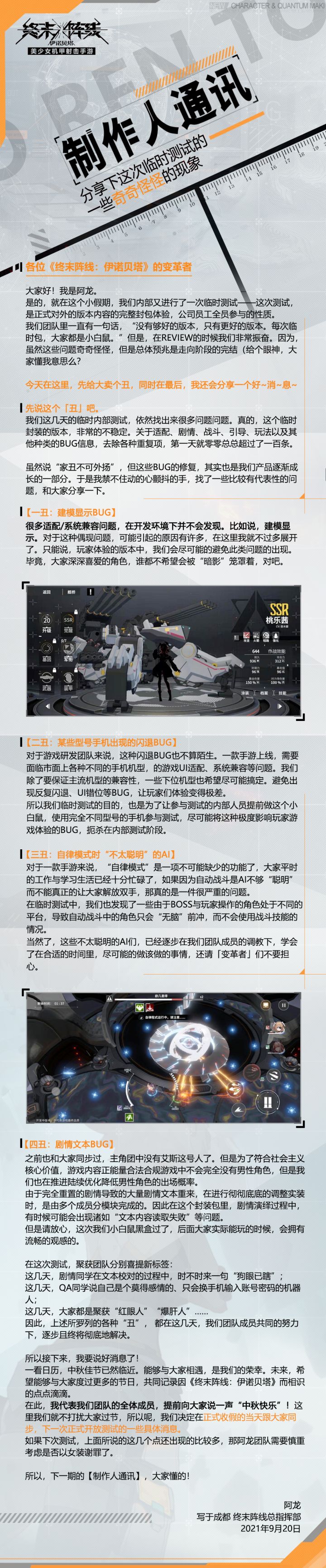 各位《终末阵线:伊诺贝塔》的变革者: 大家好,我是阿龙。最近挨了比较多喷,花了一点时间消化和接受,思索之后,决定来和各位朋友谈点大家关心的游戏内容。因为想讲的有点多,没办法一篇通讯讲完(毕竟小团队,制作人也要搬砖),不整那些虚头巴脑的,我分几轮给大家讲讲我们打算怎么做,以尽力达到玩家的要求。今天先讲讲基于新版本的整个大方向,也是上一篇通讯下面大家关注度比较集中的一些内容改进吧。写在最前面,