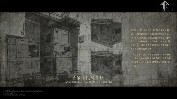 灯塔发展早期,为应对人口增长和设施修复等问题,灯塔回收地面保存完整的各类型建筑单元,切除非必需的结构,通过焊接拼装与改造,建成符合《灯塔载重规定》的结构单元,悬吊于灯塔外围。其中大部分被用作为居住区,其余则成为灯塔用于修缮的建材储备。三大法则颁布之后,上民迁入灯塔主体的居住区,尘民则被划入危险系数更高的悬吊区。高密度的房间加上悬吊的方式,让这里成为尘民口中的“鸽子笼”。