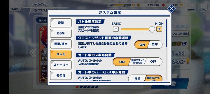 给日语苦手们分享一个设定:按下图设定的话,可以不播放四星卡的技能动画,战斗速度更快,然后有一个是大招憋到最后一关才放(按个人需求选择)作为一个日语小白摸索出来的😂(咱日语一点都不会)这样下来一场战斗更快了。