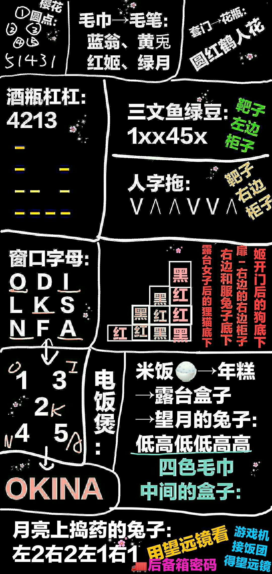 首先通过门的图案可以确定瓶子的图案方向,获得乒乓球拍 接着选择球拍打乒乓球,解开旁边的房间 走到这个房间,根据地上的木块来解开右边的柜子,获得扇子 再根据酒瓶的条纹解开这个柜子,获得小刀 用小刀解开上面布的绳子,得到一个盒子 根据蒸笼包子的位置可以解开这个柜子(右下,上,左下,右,上),获得胡萝卜 根据寿司的绿豆位置(1,4,5有绿豆),解开右边的柜子,获得印章 根据字母表,对应电饭煲的数字,解开