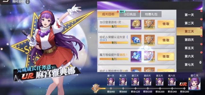 七日活动实际上一共有三项,咱们来挨个看一下~成长目标:简单的目标拆解:想要获得成长目标最核心的奖励UR麻宫雅典娜,一共需要280点积分,而每天任务积分总数为45点,7天总共有315点,所以并不是要完成所有的任务才能获得奖励,我们可以进行简单的选择。具体如何完成:1.最简单的每日登录x7,保底能拿到35积分2.正常推主线剧情+经纪人升级,这也是在正常游戏进程中的,不需要特地去完成,也是保底