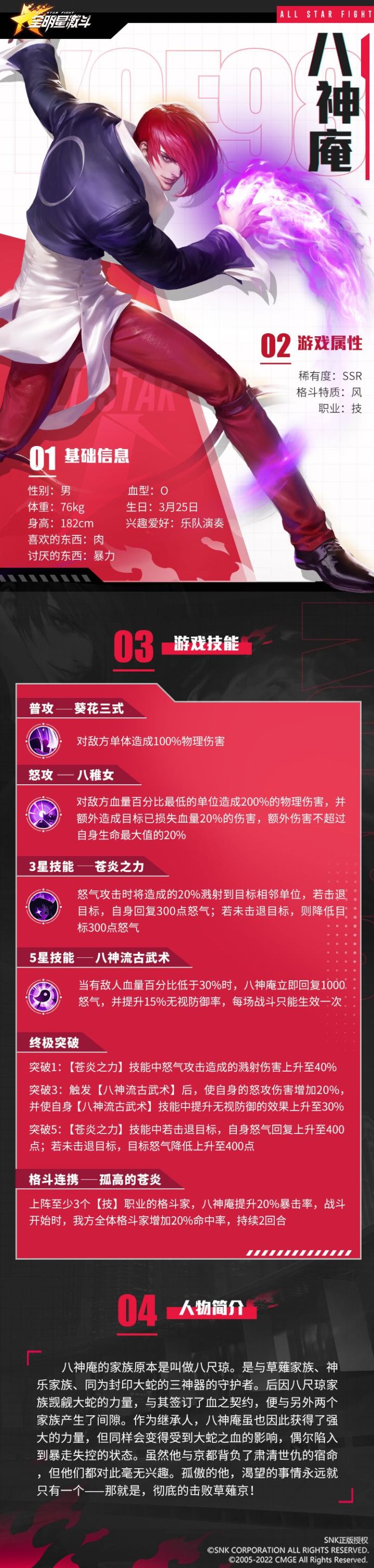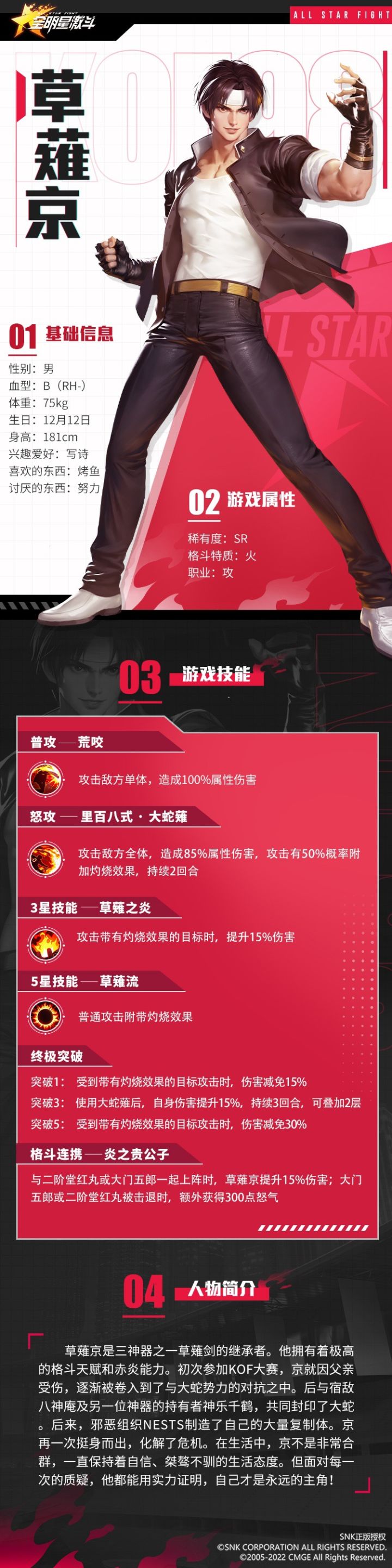 草薙京是SNK系列中的男主角,也是在《全明星激斗》中首个登场的人物。他贯穿整个故事剧情系列,也会陪伴大家开启格斗之城的热血旅途。草薙京拥有赤炎的力量,极高的格斗天赋,继承了草薙流的古武术。跟随下方长图,一起看看这位天才格斗家——草薙京。