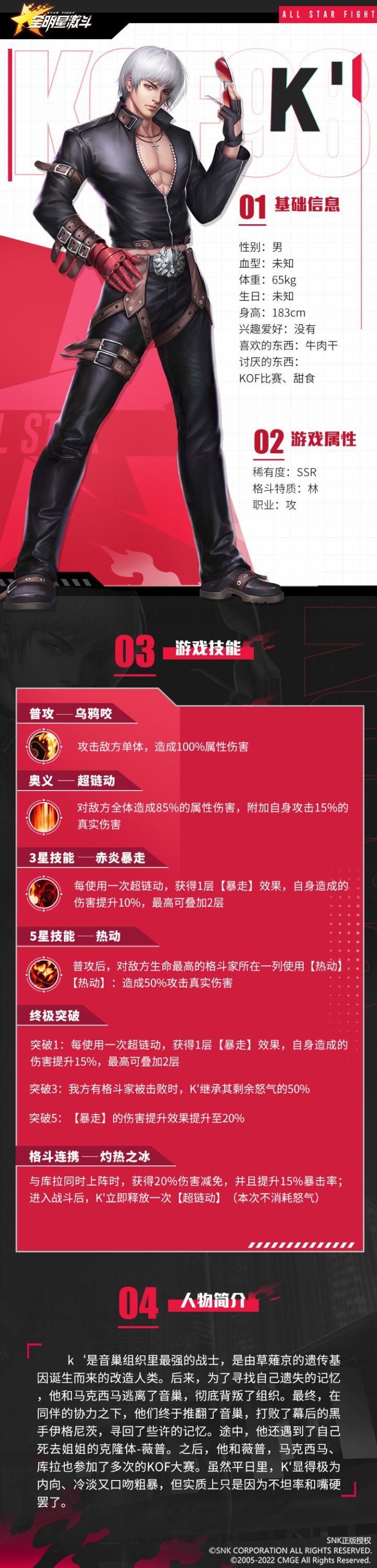 K'是音巢织最强改造战士,拥有草薙京所移植的“赤炎”能力。他曾经参加多次KOF大赛,并在伙伴的帮助下将整个音巢组织剿灭。银白色的短发,黝黑的皮肤,身着黑色机车服、十字架项链、黑色皮鞋,右手佩戴红色的机械手套,左手为黑色格斗手套,头上总是架着一副太阳墨镜……桀骜不训,言语刻薄的K’是一名自信而骄傲的格斗家,也是一名冷峻而帅气的神秘男子。本期格斗家档案,为大家带来的是放荡不羁的改造战士——K'。