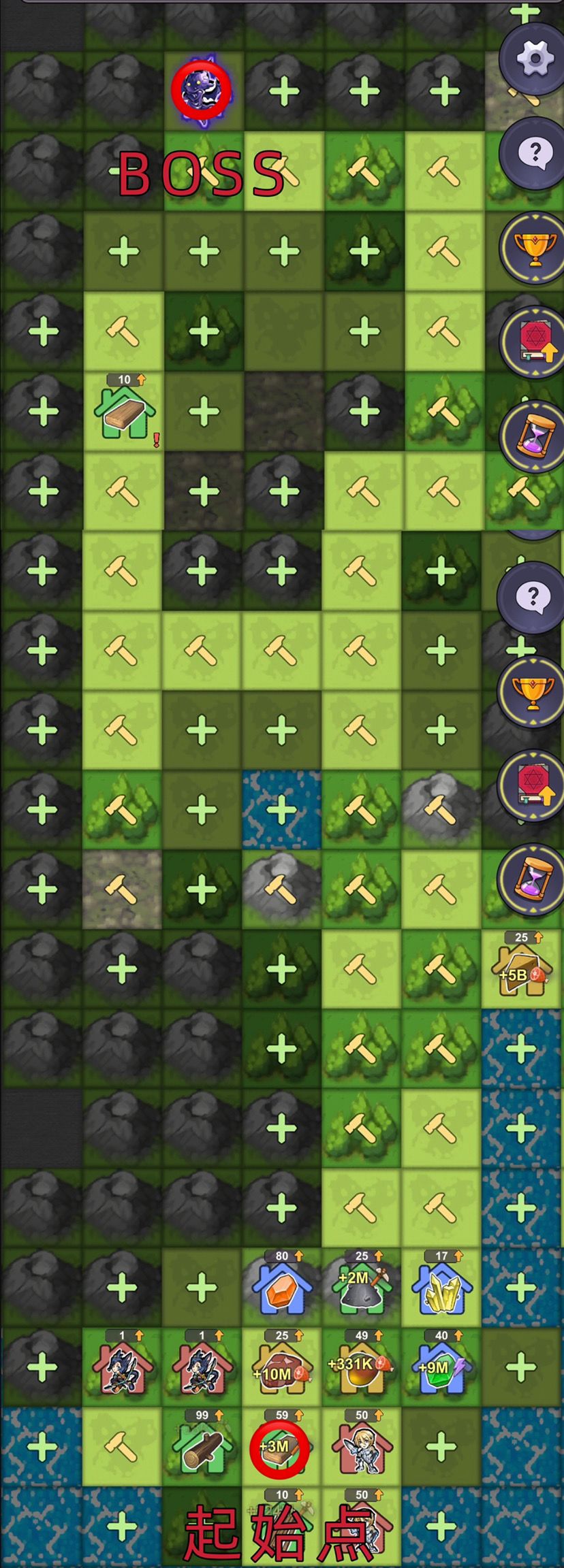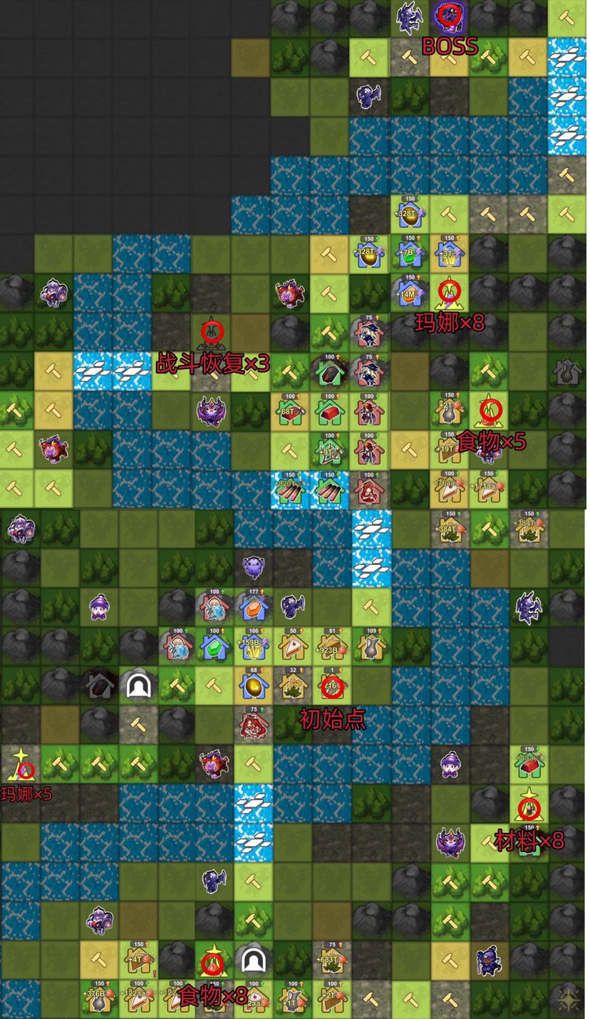 (🙋🏻♀️UP主很在乎点赞收藏,不点赞会很难受) ⭐️首先每张图Boss位置和资源塔都是固定位置的。 只需要按固定路线扩张就可以,少走弯路,尽早通关 *(UP主已通关,我就给路线和BOSS位置,具体怎么玩自己去探索) Boss队伍: (我这个队伍阵容是通关后,随便打的) 第一张图怪等级都很低,过关很容易 圣枪:超过40级 游侠:超过40级 一回打不过那就再等兵回复继续干它