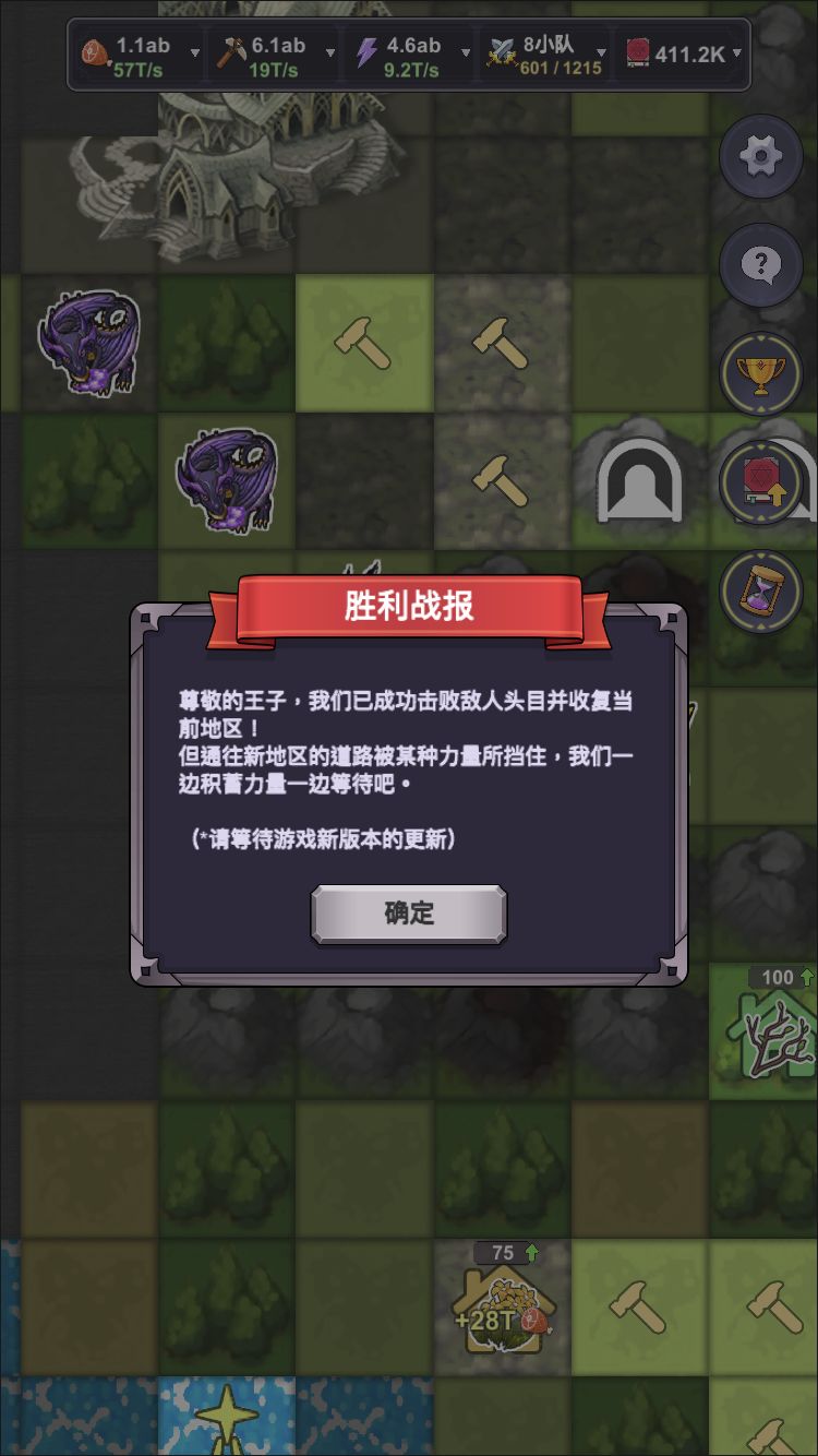 游戏是好游戏,可惜不赚钱,有很多点作者没来的及完善 休闲游戏本来也没啥看攻略的必要,但是游戏的确因为设计缺陷让人多走了些弯路。也算是乐趣的一部分吧生产科技的话,食物->花园,材料->仙果,玛娜->凝结炉,往8倍区域一放就行。看我第一张图的每秒收入就有数了。 最后的boss靠部队拿命去填,所以最好把部队加速的地方占了,活得快。 最终阵容2队魔法侍卫3队圣枪3队火法,全靠烧人的伤害(作者是不是FFF团