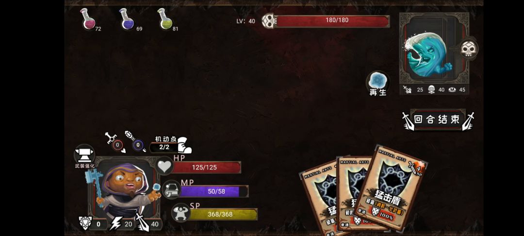 下面是我带的卡,多带几张全副武装和当头一棒,腐朽盾我带的2张。这个游戏的护甲机制是99护甲的怪你1000力量也只能打几十滴血,后期怪3500血+。