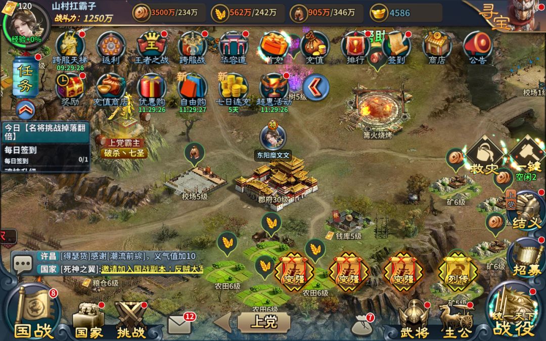 国战是游戏的核心玩法之一,在国战中玩家可以体验到三国鼎立的局势,以及一些列的事件,同时还会享有一定的国家城池分封与局势奖励,国战采用的是实时对抗的玩法模式,为本国开疆扩土,需要每一个玩家的积极参与。 【开启条件】32级开启 【详细说明】国战玩法中,拥有非常多的可操作内容,下面一一为大家解读,每个操作功能可以带来的内容。 【部队】 参与国战行动的最主要就是需要有部队,拥有部队才拥有实际的战斗能力。 1