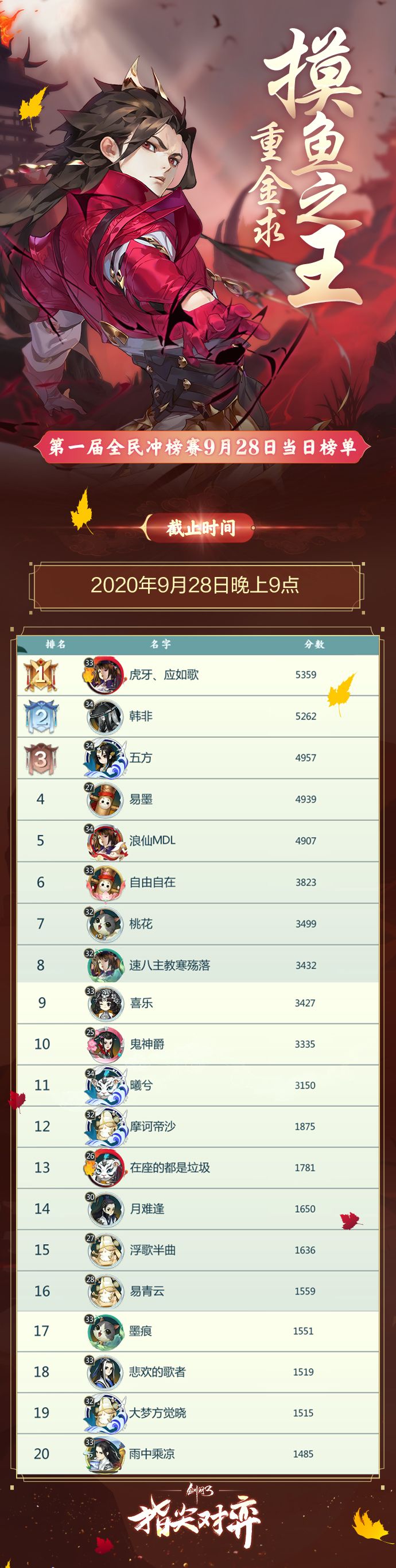 《剑网3指尖对弈》第一届全民冲榜赛火爆进行中!截止至2020年9月28日晚上9点的榜单数据公示如下图↓!快来看看吧!冲榜赛火爆进行中!战况胶着,魁首是否会再次交替?明日的榜单将如何变化?让我们拭目以待!