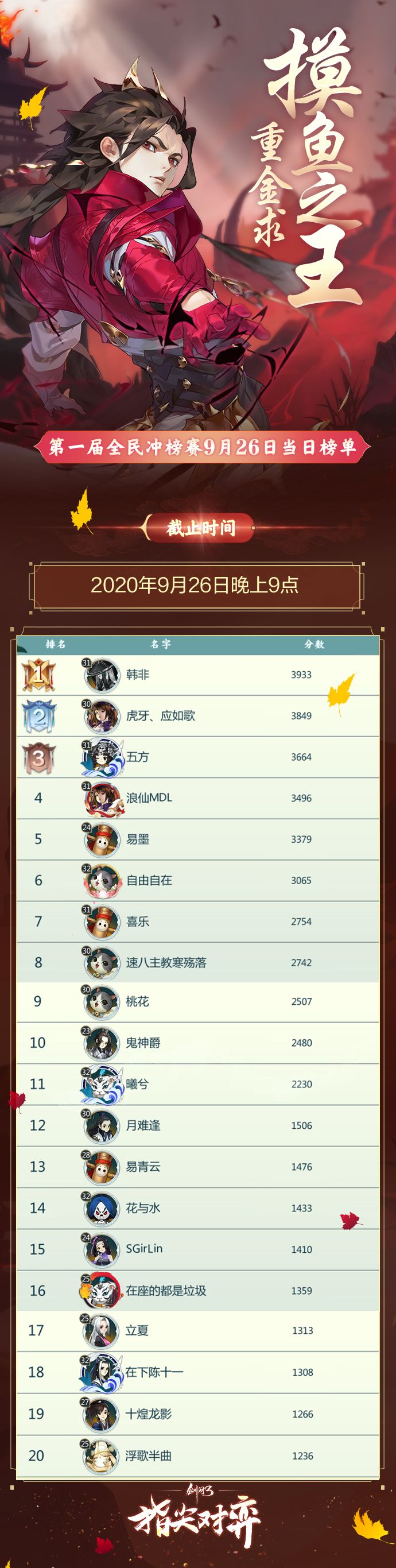 《剑网3指尖对弈》第一届全民冲榜赛火爆进行中!截止至2020年9月26日晚上9点的榜单数据公示如下图↓!快来看看吧!冲榜赛火爆进行中!战况胶着,明日的榜单将如何变化?让我们拭目以待!