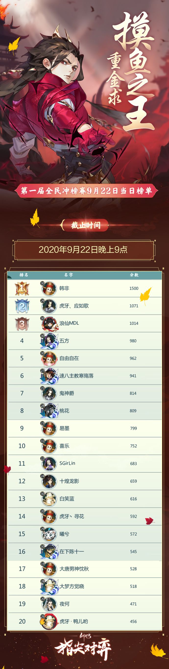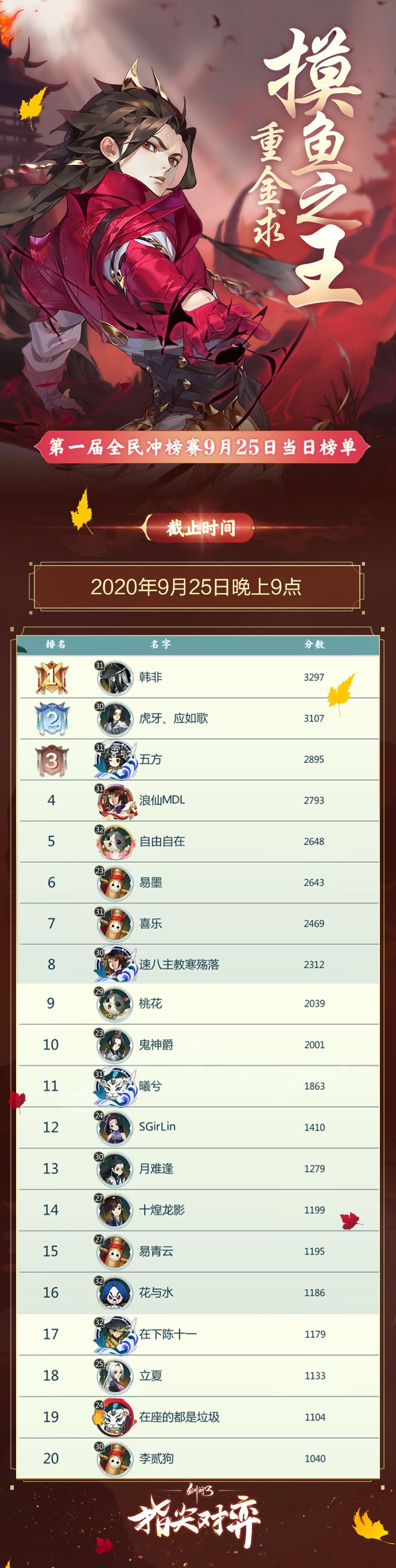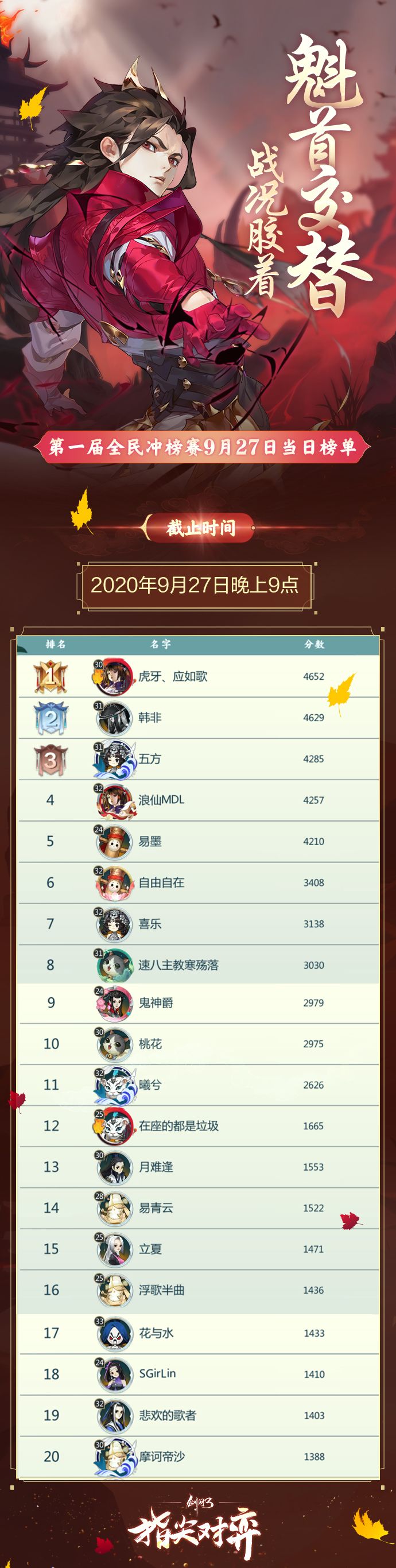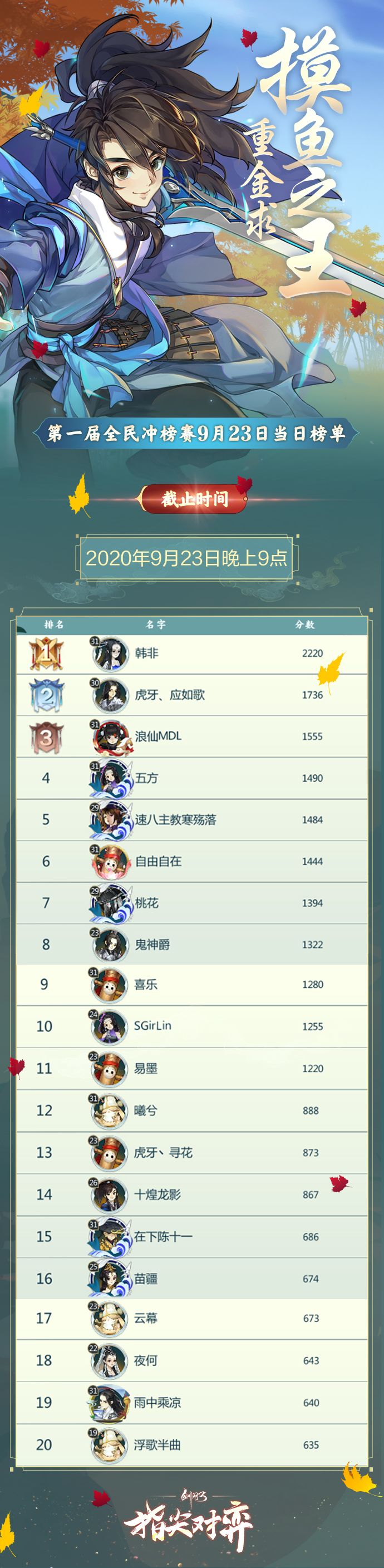 《剑网3指尖对弈》第一届全民冲榜赛火爆进行中!无数侠士鏖战江湖,只为成为魁首,夺得【万元奖金】!截止至2020年9月23日晚上9点的榜单数据公示如下图↓!快来看看榜上前20名是哪些侠士吧!冲榜赛仍在进行中!稳坐高位,还是跌落榜单,让我们拭目以待!