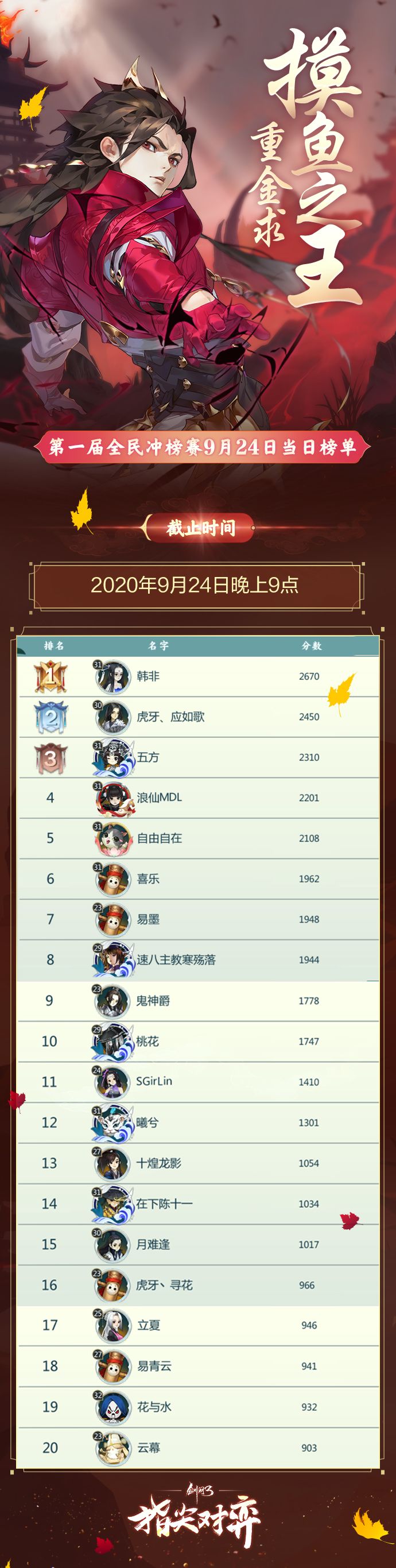 《剑网3指尖对弈》第一届全民冲榜赛火爆进行中!截止至2020年9月24日晚上9点的榜单数据公示如下图↓!快来看看吧!冲榜赛火爆进行中!明日的榜单将如何变化?让我们拭目以待!