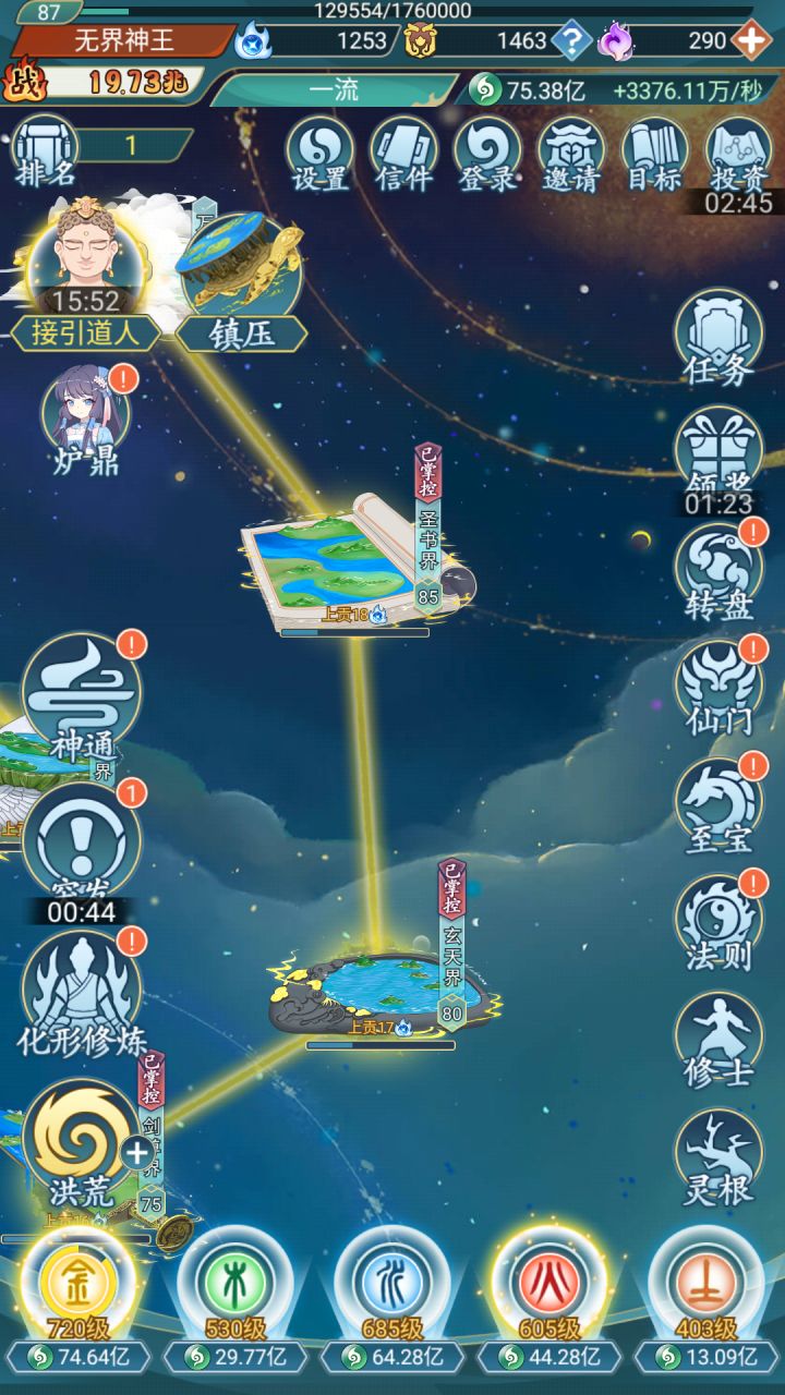 话说,今天更新版本,内容貌似没有更新??这个是目前的咸鱼状态,总修士才4500万,其中天道阶99万,可以说后续还有成长空间。天道等级上限是120级,法则等级我现在是135级,估计等级上限应该是150?灵根23种,提升灵气,都会有的。诸天万界,不包括洪荒的话,有25个,最后一个【圣赐界】特别难点~~~刚好卡在左手边的标志上神通等级上限50级大能数量30个,最后一个是盘古。至宝数量66