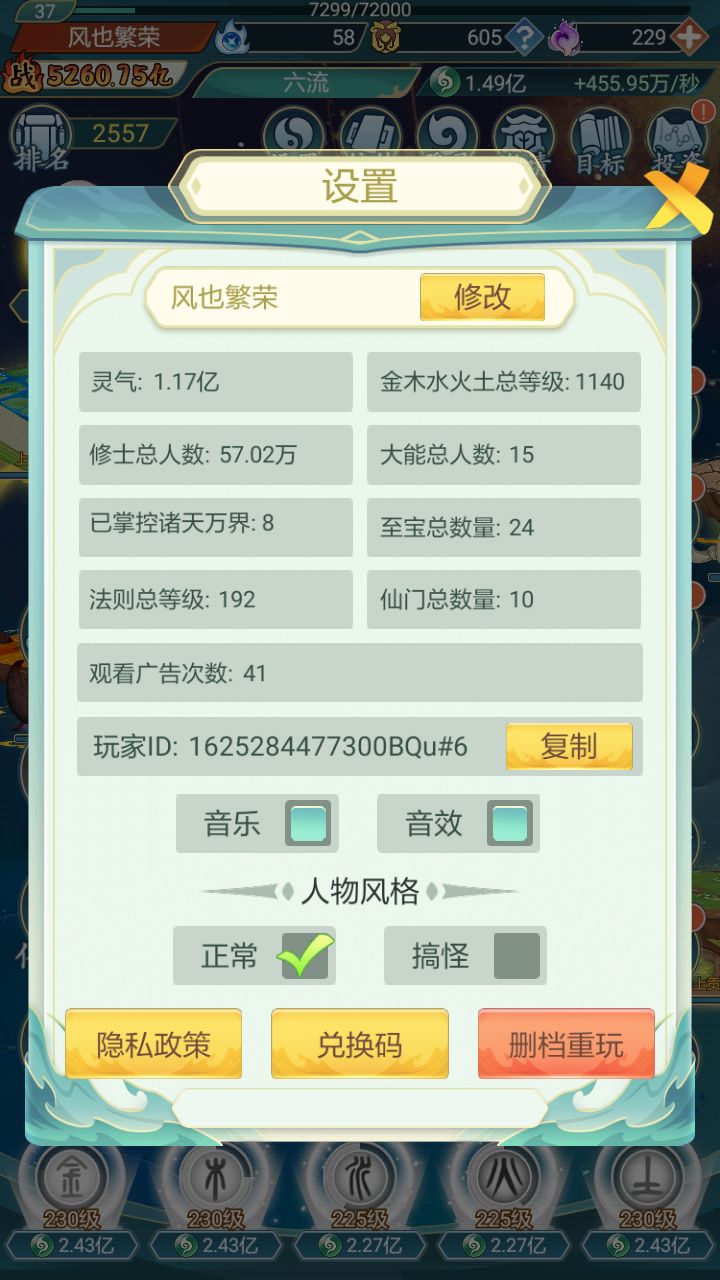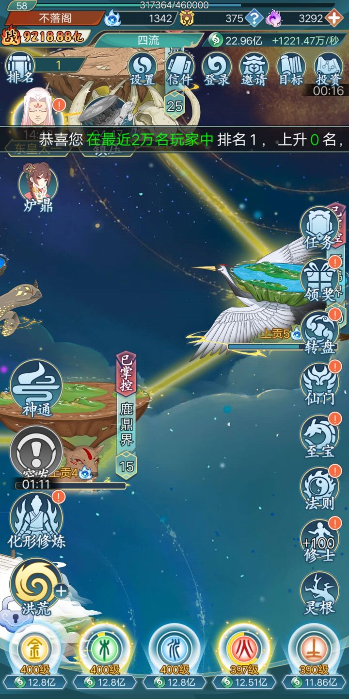 话说,今天更新版本,内容貌似没有更新??这个是目前的咸鱼状态,总修士才4500万,其中天道阶99万,可以说后续还有成长空间。天道等级上限是120级,法则等级我现在是135级,估计等级上限应该是150?灵根23种,提升灵气,都会有的。诸天万界,不包括洪荒的话,有25个,最后一个【圣赐界】特别难点~~~刚好卡在左手边的标志上神通等级上限50级大能数量30个,最后一个是盘古。至宝数量66