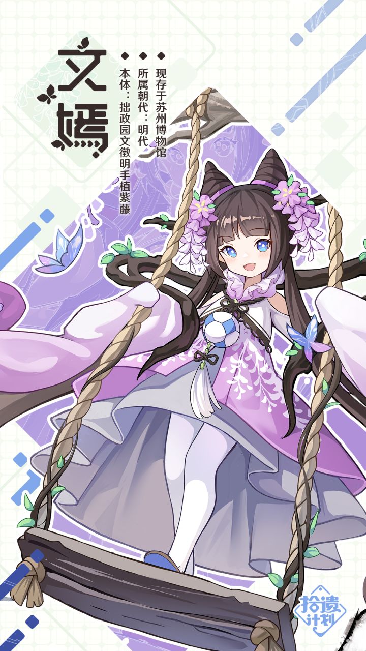 #拾遗计划# #拾遗寄偶# 【拾遗寄偶:文嫣】亲爱的管理员:好久没见管理员来查看寄偶入职的档案了~今天您要看的是——“紫萝垂檐绕砌生,蔓翠色艳斗春荣。怎么样管理员,在下这两句诗还不错吧?”以少女形态造就而出的寄偶,本体是少见的从出生之时便生长至如今的藤本植物。受所植人影响颇深,少女对诗、文、书、画皆有相应造诣。经历近五百年的风雨,却以如此轻盈的形态出现,其中大概也包含衡山先生寄于此世的某种期望与意念。“光阴或许磨去了许多过往,但在拙政园,先生亲手将我植下的瞬间,应该是永远刻在我的脉络之中了。”文物本体:拙政园文徵明手植紫藤现存于:@苏州博物馆