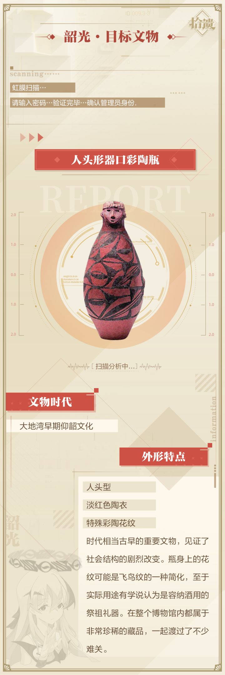 【拾遗·寄偶资料馆·韶光】亲爱的管理员,久等啦!今天为您带来的是第一位寄偶的资料档案,她是人头形器口彩陶瓶为原型的寄偶:韶光。除了参与前线战斗,似乎有什么更重要的任务由这位少女来承担……“管理员,我将在您身边‘记录’直到最后一刻。”小知识:目前人头形器口彩陶瓶存放于甘肃省博物馆哟!看在小十一辛苦且不鸽的份儿上,想要管理员们的互动!夸夸小十一这个小可爱,就会有更多饼,不是,更多资料发布哟!