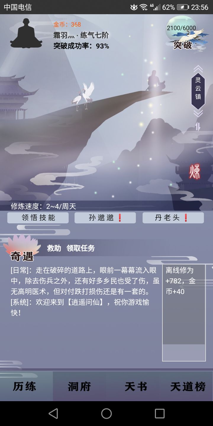 游戏主界面按照从上到下,从左到右的顺序来有个光头的人物,点击可以设置音乐,音效金币,游戏内部通用货币(在群里可能有别的,建议新手直接加群,有大佬送装备的话,白嫖装备挺好的🐶)目前金币获取途径:做任务,玩家赠送(也是游戏内交易的方法)境界不用多说突破概率,这个有点迷,关键吧,看脸🐶修为突破,比如说你需要100,你刚好100就不能突破,101就可以,迷之操作🐶表面上是背景图,实际上是材