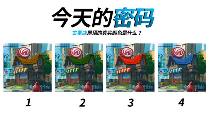 噢不!一些坏蛋把油漆泼到古董店的屋顶上了!雷娜得把屋顶粉刷成原来的颜色,但她似乎不太记得原来的颜色是什么了,你能帮帮她吗?屋顶 1: AZ54GN76屋顶 2: KJ45JT45屋顶 3: ER41FN34屋顶 4: KL90HG67只有正确的答案才能在游戏中兑换礼包哦!你找到正确答案了吗?那么在游戏内的“设置”页面输入礼包码领取你的奖励吧!你已经等不及想见见其他玩家或者讨论讨论游